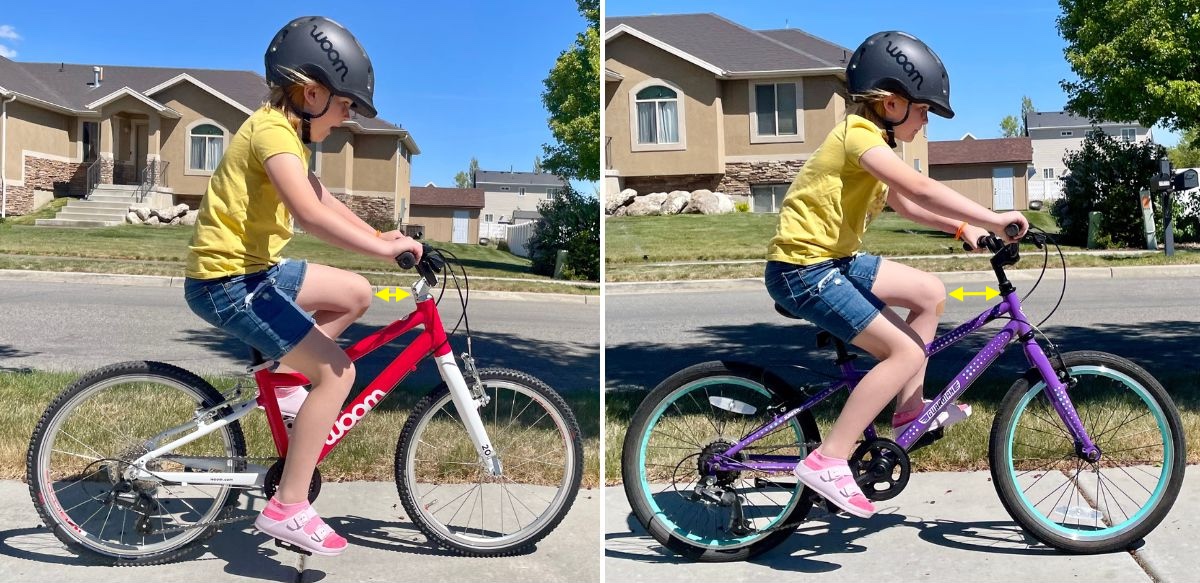 A bike with a lower q-factor provides more efficient pedaling as kids are able to focus more of their physical effort on pushing directly down on the pedal. As shown below with our 6-year-old tester, the woom 4 is narrower than typical 20″ bikes, making it more efficient and easier to pedal.